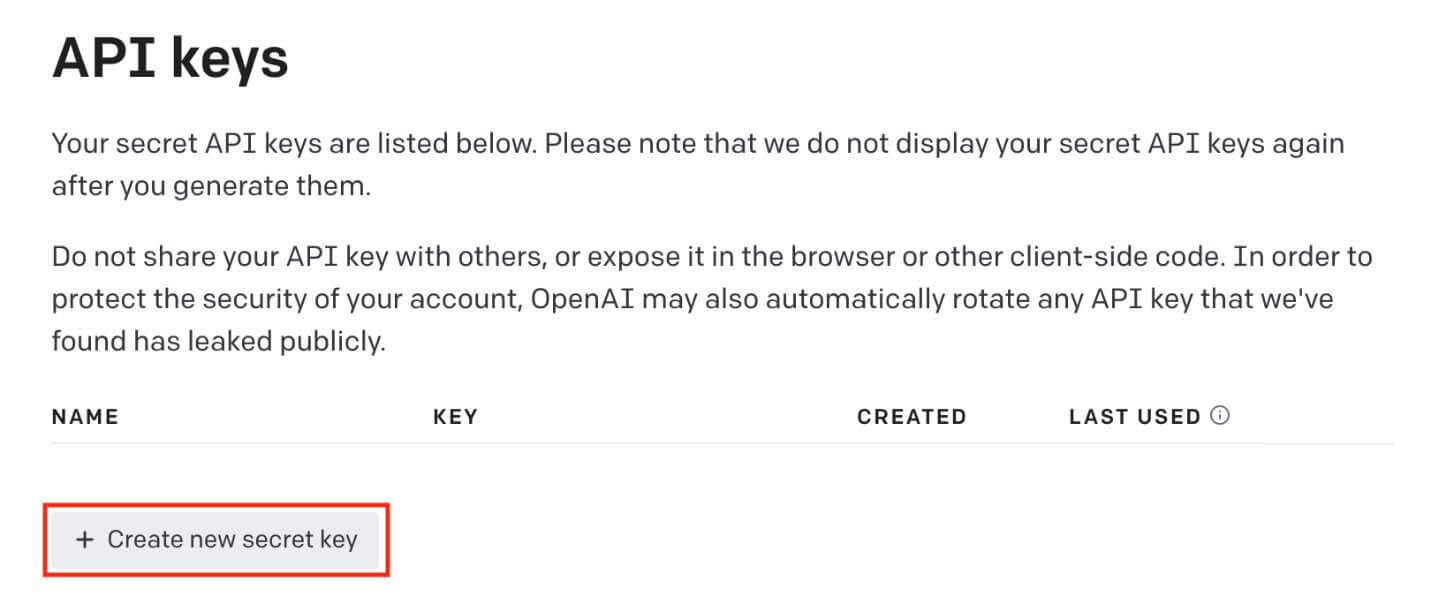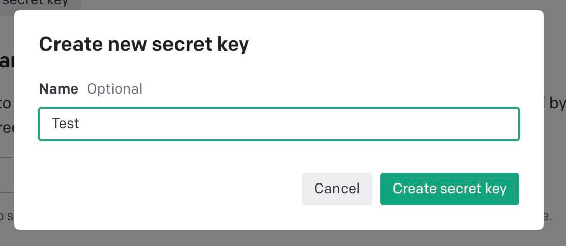- Chọn “Create new secret key” (Tạo khóa bí mật mới)